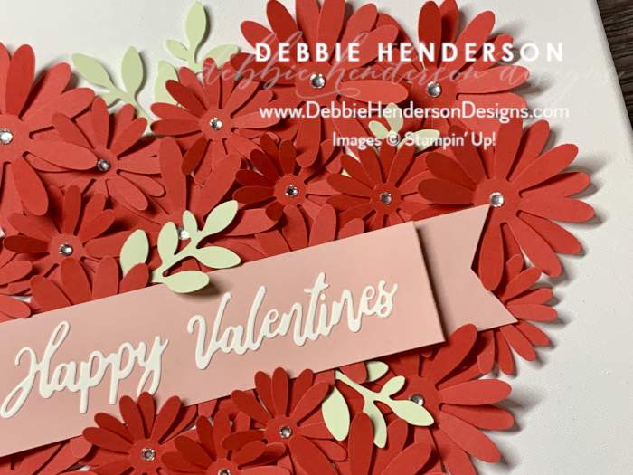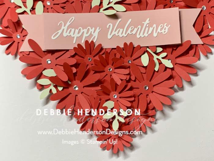 It’s almost Happy Valentines Day and I had this idea in my head that required the use of the Daisy Punch and the Medium Daisy Punch and look what I created! I also added some sprigs of color using the new Bough Punch, Rhinestone Jewels and a banner with Happy Valentines from the Word Wishes Dies.