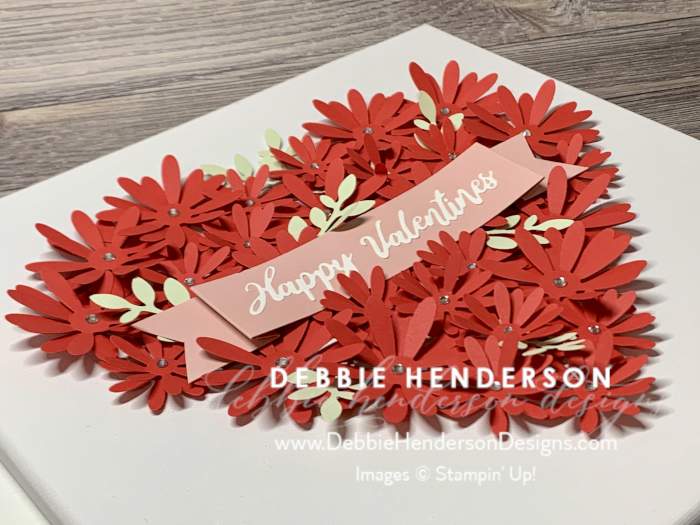 I created a paper heart that was hand-drawn, placed it on my 12 x 12 artist canvas and traced it lightly with pencil as a guide for gluing all of my flowers. All of the flowers in both sizes were double stacked and I glued them on with Stampin’ Dimensionals. Isn’t that a fun look? If you would like to replicate my work of art, you can click on the products below or the All All To Cart button below: