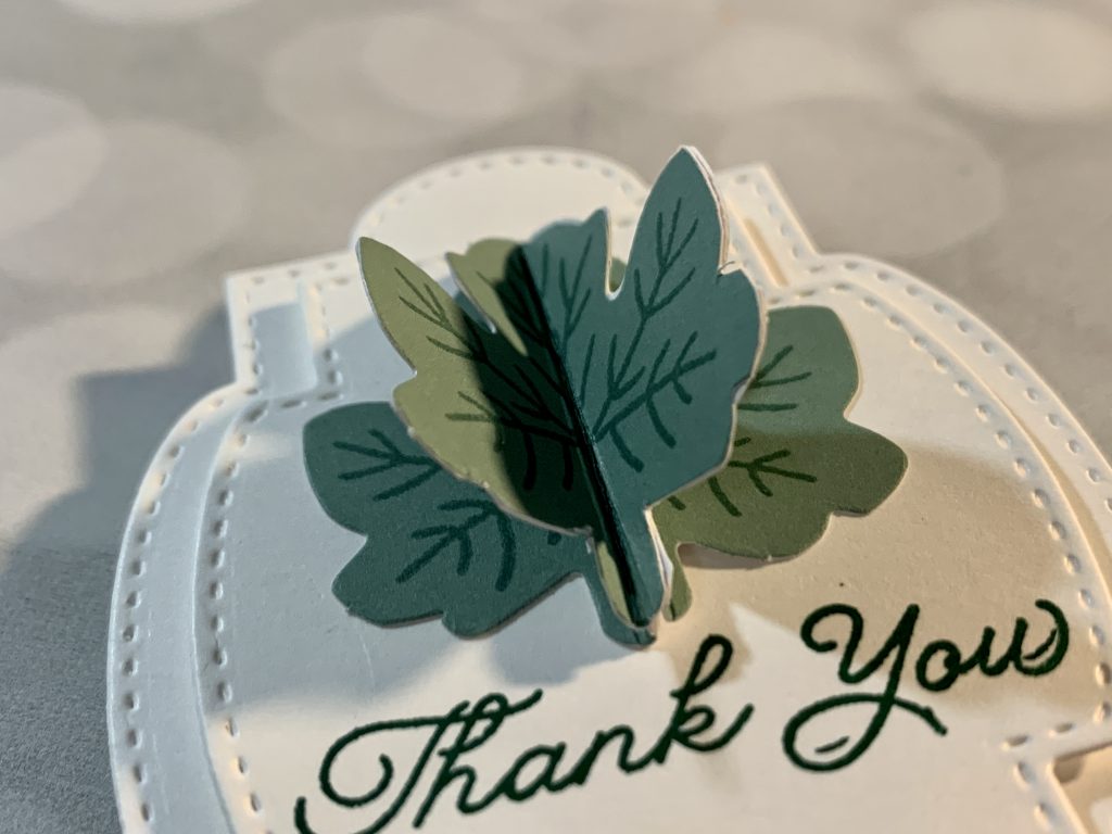- Leaves: Stamp the leaf detail using the stamp image with Shaded Spruce Ink on three of the diecut leaves. Fold all three leaves in the center vertically. Add glue to half only of one leaf and press a second leaf (white to white) and repeat for the third leaf. Use Paper Snips to trim excess white showing from each leaf. Add adhesive to the back of the leaves and press in place above the sentiment. The leaves will fold flat when needed.