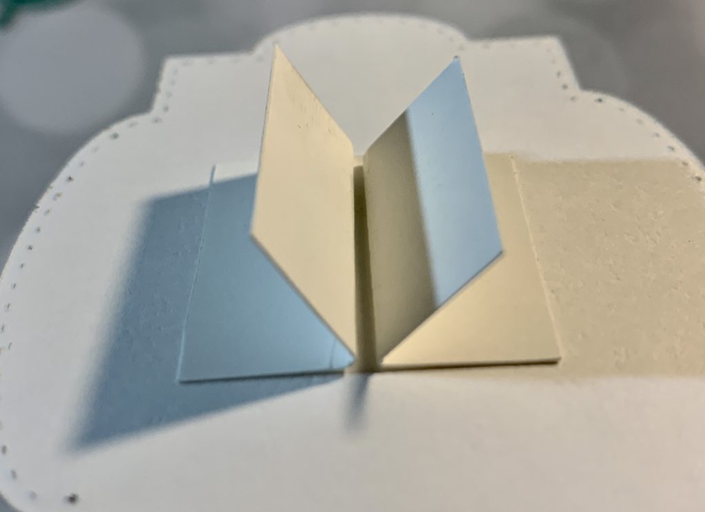 - Labels: Cut one each using the two large labels from the Stitched So Sweetly Dies with Basic White Cardstock. Stamp the sentiment on the bottom of the smaller label using Shaded Spruce Ink. Glue both labels together using Stampin’ Dimensionals. Cut (2) pieces of Basic White Cardstock 1″ x 1″ and fold in half. Glue to the back of the large diecut label as shown in photo 2 below. Press in place. Add adhesive to the two flaps at the top and glue in place on the card front, aligning the fold on the center to the middle of the two pieces of cardstock on the back of the label. This will allow the labels to move with the card as it is opened and closed.