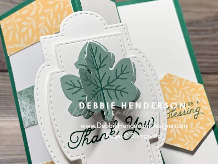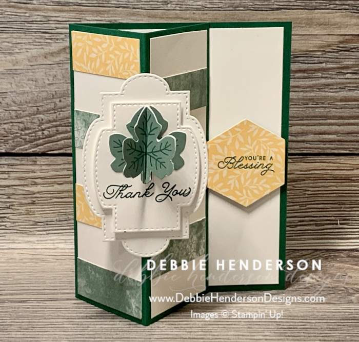 This is called a Side Easel Card Fold. The hexagon shape is glued in place with Stampin’ Dimensionals so that it is raised and holds the folded portion of the card in place. And the card folds flat as you can see in the second photo below: