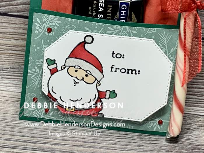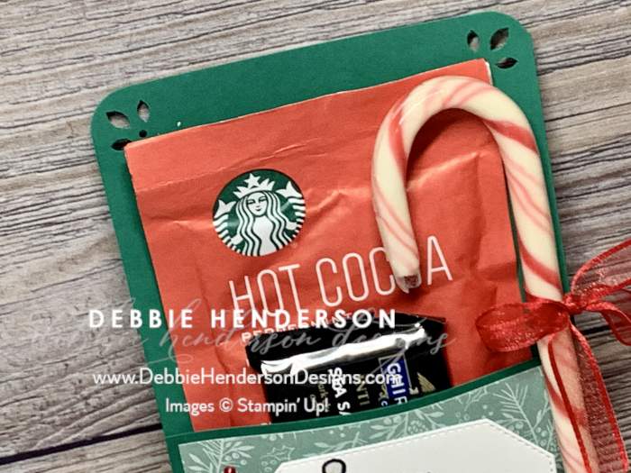 Today’s project is one that I showed during my weekly Afternoon Tea Time & a Card Class on Facebook. It’s a great way to display a packet of hot chocolate, a candy cane and a Ghirardhelli Chocolate: