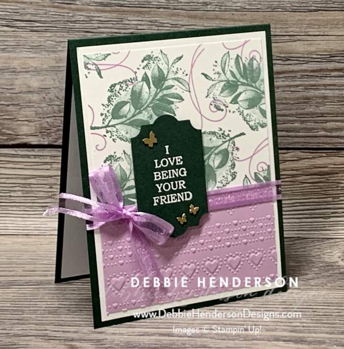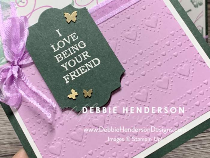 I hope I have convinced you that this is a must-have stamp set for your collection. My favorite part about today’s stamped images is the beautiful detail achieved with Just Jade Ink and the swirls with Fresh Freesia Ink. Did you notice the embossing on the lower half of both cards? The Dotty Hearts Embossing Folder is beautiful!