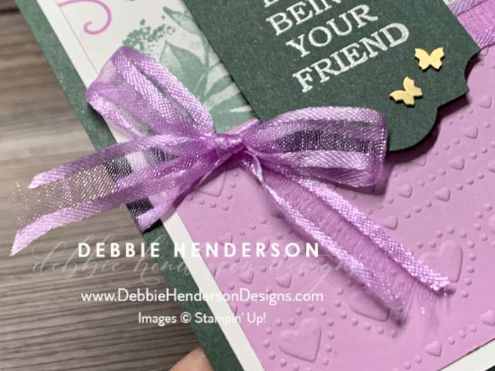 - Sentiment: You will need two. Stamp the sentiment on Evening Evergreen Cardstock using VersaMark Ink. Sprinkle with White Embossing Powder and melt with the Heat Tool. Cut each sentiment using the Everyday Label Punch. Glue to card front near the bow using Stampin’ Dimensionals.