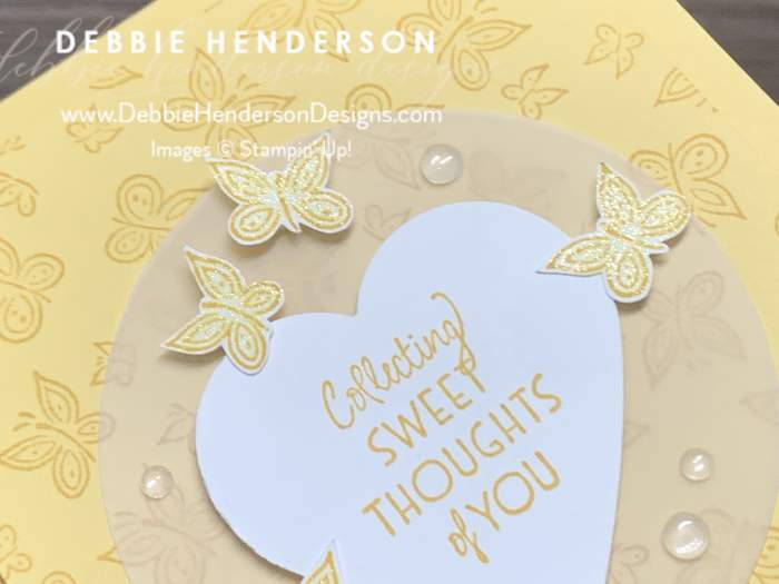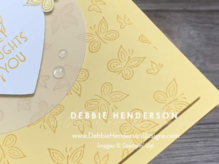 Topping it off the stamped background with a circle cut from Vellum Cardstock really tones down the stamped butterflies underneath. It’s a great way to add interest to your card. I love using Vellum but oftentimes forget I have it.