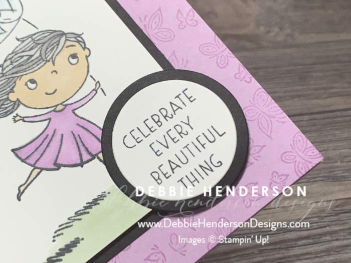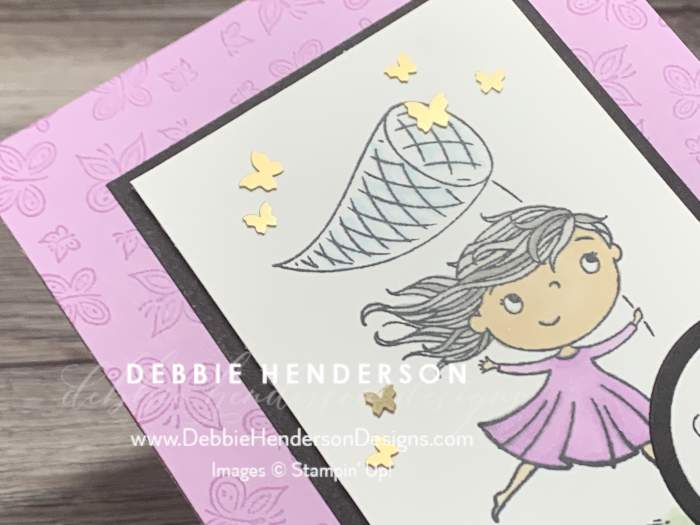 I did something a little different for Day #4 with my Catching Butterflies stamp set. I opted to not added stamped butterflies that our little girl is trying to catch. Instead, I added our Brushed Brass Butterfly embellishments. These neat butterflies come in two sizes and are adhesive-backed. I just pick them up with my Paper Piercer and then press them in place. Aren’t they beautiful?