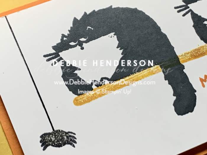 - Stamp the spider on the bottom left-hand corner using Tuxedo Black Ink. Draw a thin black line to the spider from the top of the cardstock using a Basic Black Stampin’ Write Marker.