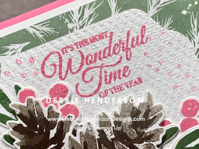 I love the sentiment “It’s The Most Wondeful Time Of Year”. A time for the birth of Jesus, time spent with family and lots of Christmas food. I used the Tasteful Textile Embossing Folder on the sentiment layer after I stamped. It gives the stamping a neat look.