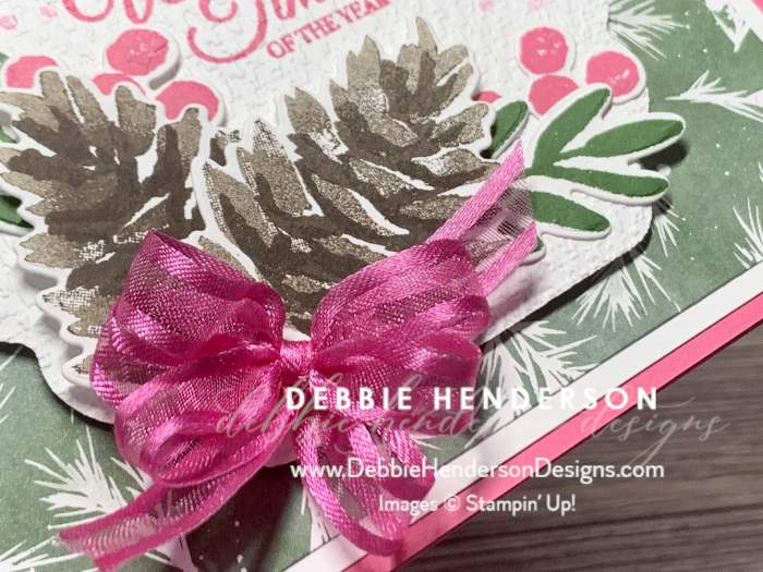 - Glue the pinecones with Stampin’ Dimensionals. Tuck and glue the branches and holly berries under the pinecones.