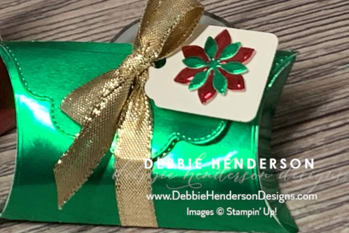 - Ribbon: Wrap the ribbon around the pillow box to keep it closed and thread the tag through before you tie the bow. Position the tag where you would like it and then tie a bow. Trim the ends of ribbon at a angle.