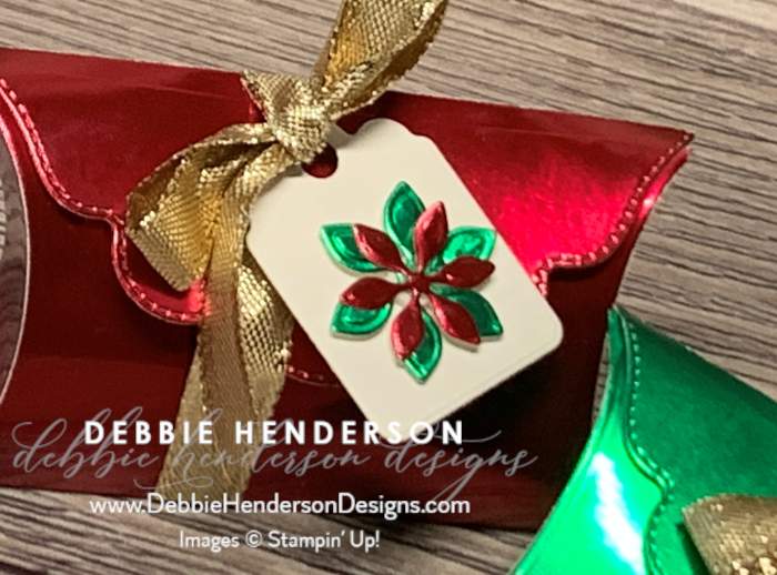 - Project Base: Use the Pretty Pillow Box Die to cut the shape. Cut (1). I used the Red & Green Foil Sheets. Fold on all of the score lines to shape each box.
