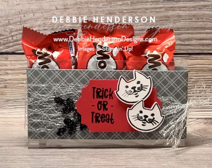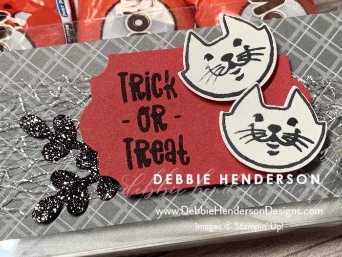- Sentiment: Stamp the sentiment from the Cutest Halloween stamp set using Tuxedo Black Memento Ink on Read Red Cardstock. Cut using the Everyday Label Punch, placing the sentiment on one end. Glue to box front using Stampin’ Dimensionals. TIP: I added dots of liquid glue on the dimensionals since you are gluing to ribbon.
