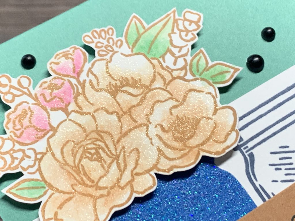 I love how my flowers turned out. They are so subtle and beautiful. I stamped with Soft Suede Ink and then colored with Watercolor Pencils and a Blender Pen, topped off with Wink Of Stella Clear Glitter Brush.