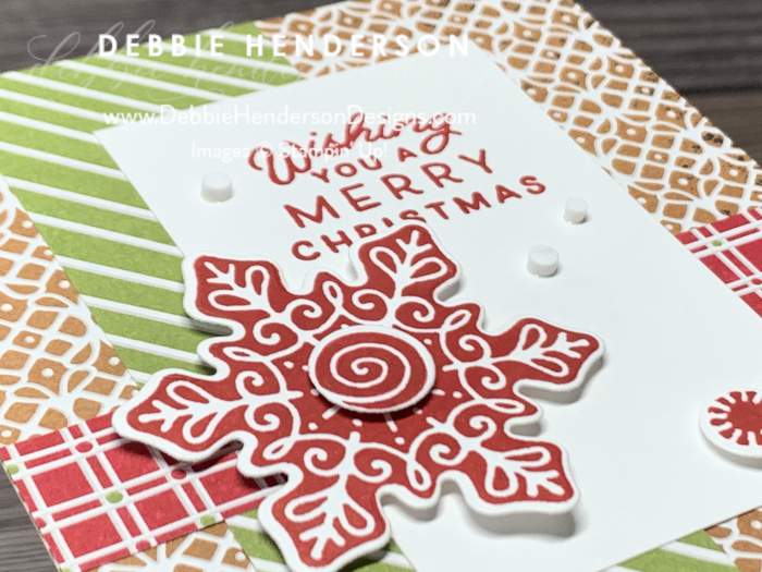 I chose to use our Frosted Gingerbread Bundle for my card today. I used three layers of the Gingerbread & Peppermint Designer Paper and added the stamped snowflake & peppermint candies. Everything looks so pretty when it is well coordinated.