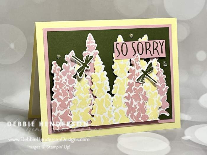 - Dragonflies: Stamp (2) dragonflies on Basic White Cardstock with Mossy Meadow Ink. Cut with the die. Glue to card front with Mini Stampin’ Dimensionals.