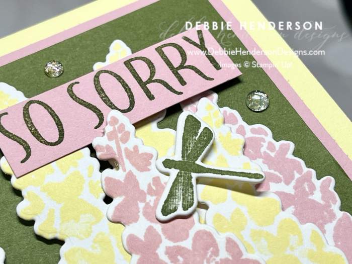 - Sentiment: Stamp the sentiment with Mossy Meadow Ink on Pretty In Pink Cardstock 2-1/8 x 5/8/ Glue to card front.