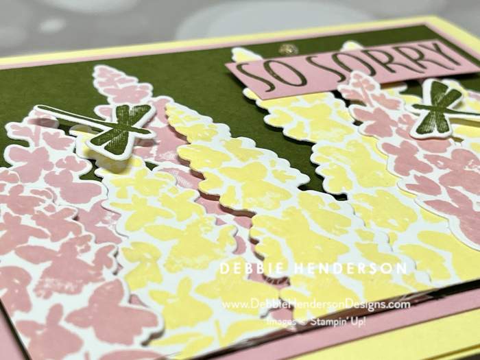 - Snapdragons: Stamp a bunch of assorted snapdragons using all three images in Pretty In Pink and Lemon Lolly Inks. Cut with the dies. Start layering on the Mossy Meadow Cardstock layer by adding some flat and then adding more with Stampin’ Dimensionals. Trim to fit on the edges. Glue cardstock layer to card front.