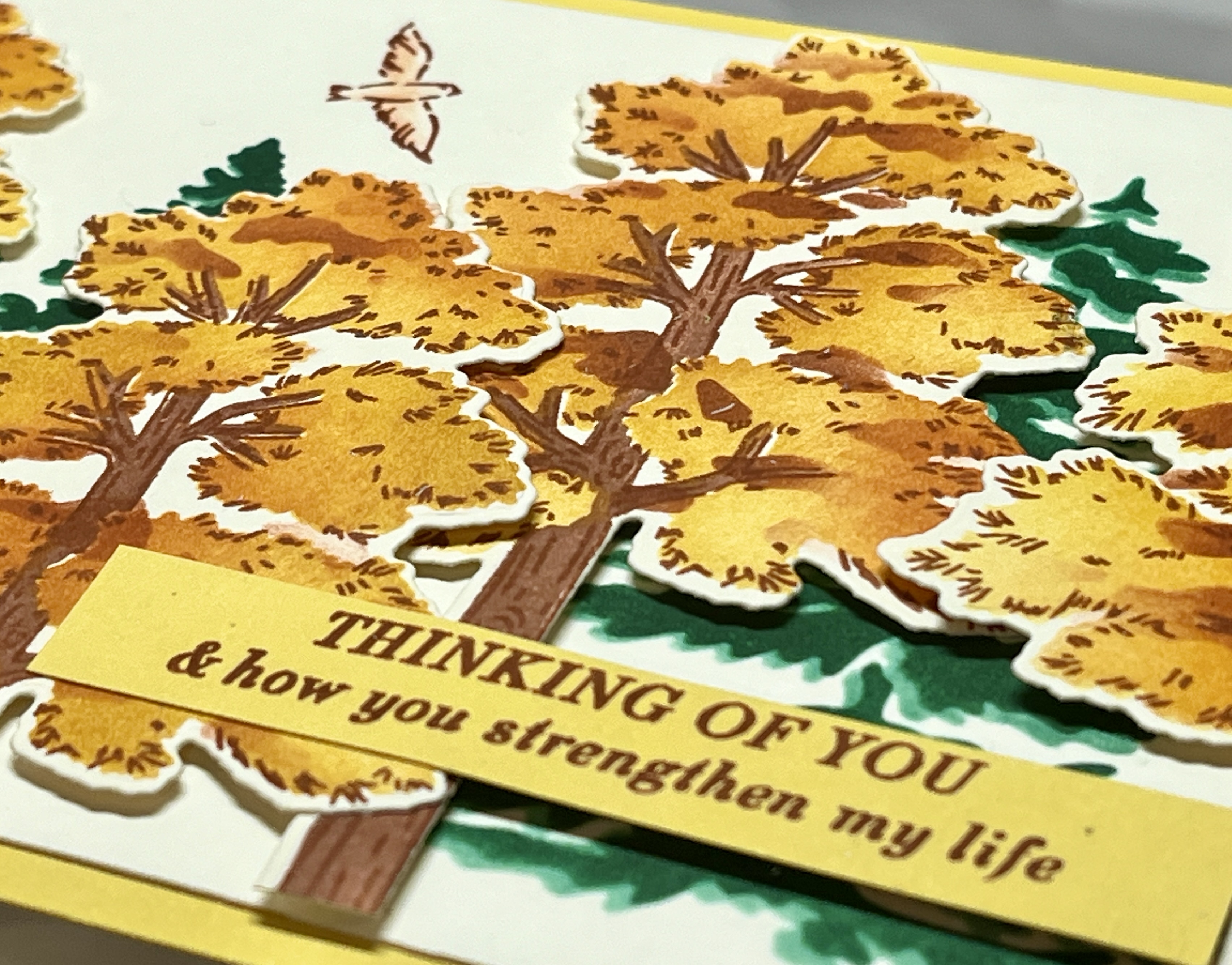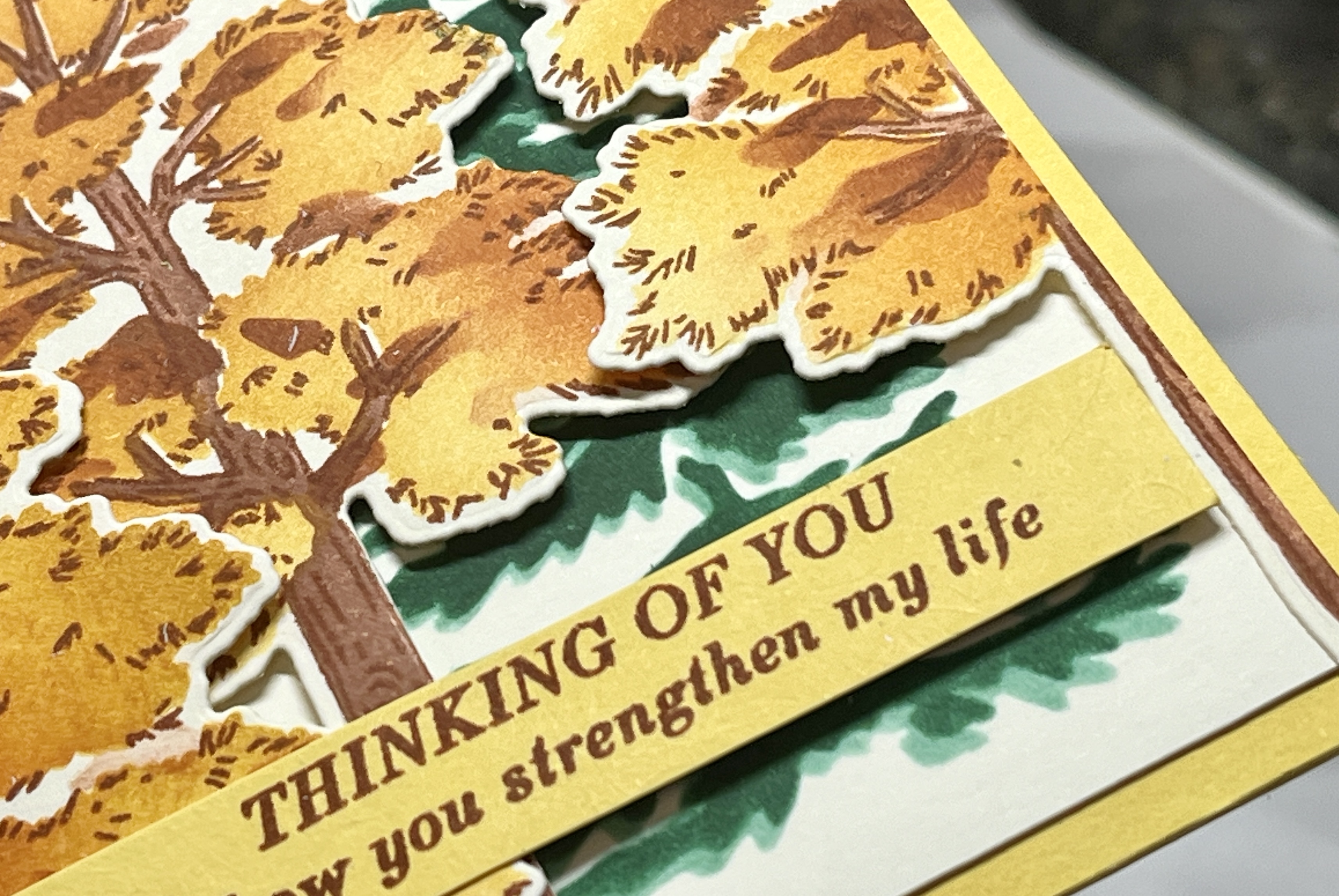 - Sentiment: Stamp the sentiment with Cajun Craze Ink on Daffodil Delight Cardstock 3 x 1/2. Glue over the trees.