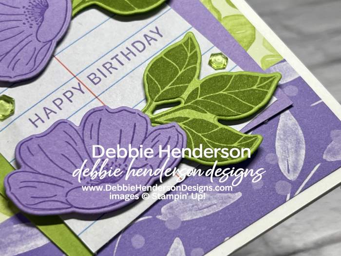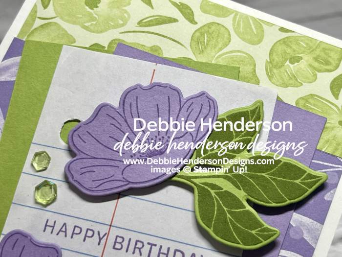 • Flowers: Stamp 2 flower images on Highland Heather Cardstock with Highland Heather Ink. Cut with the die. Glue to ruled paper with Stampin’ Dimensionals.