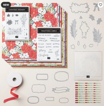 Stampin’ Up!’s CHRISTMAS GREENERY BUNDLE contains two step images to quickly create texture and dimension in the colors you want! Use the poinsettia and greenery images for a festive feel to your holiday cards and projects! We’ve combined this CHRISTMAS GREENERY BUNDLE with the coordinating TRADITIONS OF CHRISTMAS 12×12 DESIGNER PAPER accented with touches of gold for capturing the spirit of the season. In our CHRISTMAS GREENERY COLLECTION, you’ll get step-by-step tutorials for SIX projects…four cards and two cute table favors!