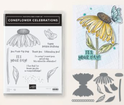 Use Stampin’ Up!’s CONEFLOWER CELEBRATIONS BUNDLE to decorate your cards with cornflowers and butterflies plus add a sweet birthday, belated birthday or thank you greeting! You can even create a card or tag shaped like a coneflower with the CONEFLOWER CELEBRATIONS DIES. Or, cut a single flower to add to a card front and embellish with die-cut stems, leaves, and butterflies. We’ve paired the CORNFLOWER CELEBRATIONS BUNDLE with the bright patterns in the CELEBRATORY SIPS 12×12 DESIGNER PAPER. You’ll get step-by-step tutorials for SIX card projects…four regular and two fun-fold cards!