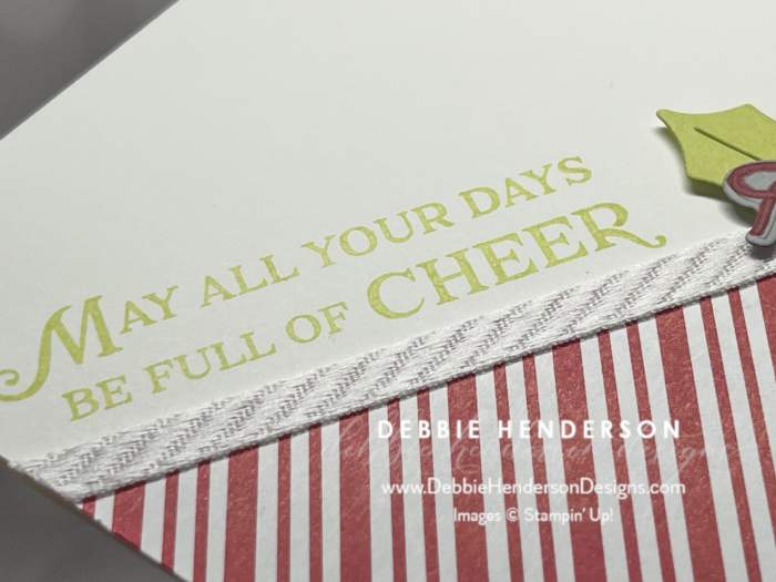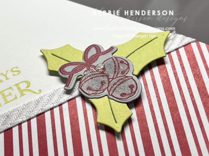 - Holly: Cut the holly leaves with the dies and Lemon Lime Twist Cardstock. Glue to the left of the senitment and on the ribbon with Stampin’ Dimensionals.