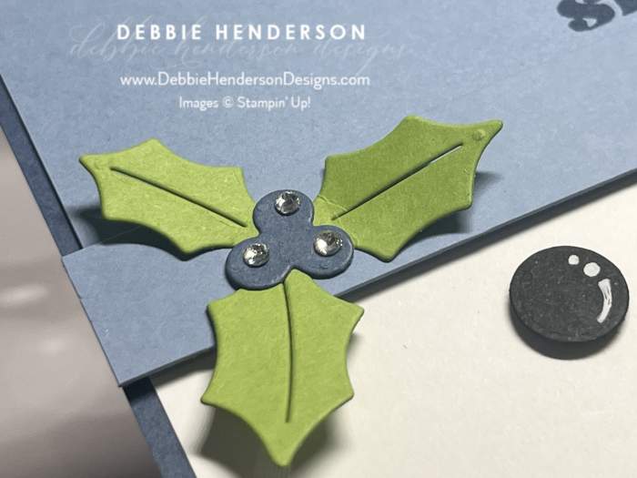 • Holly & Berries: Use the dies and Granny Apple Green Cardstock for the holly and Misty Moonlight Cardstock for the berries. Glue flat to the brim of the hat. Add Rhinestone Basic Jewels to each berry.