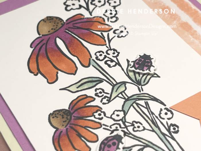 I love the large images you can color from our Mixed Florals Bundle. I used Stampin’ Blends after I stamped with Memento Black Ink. See the cute little ladybugs too?
