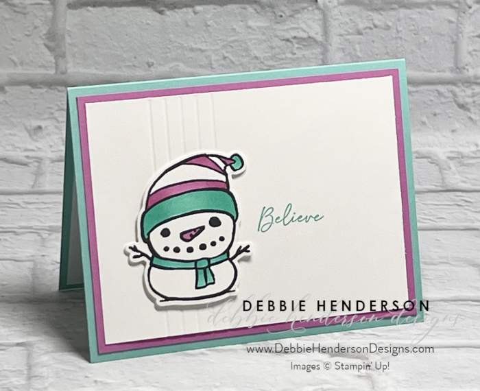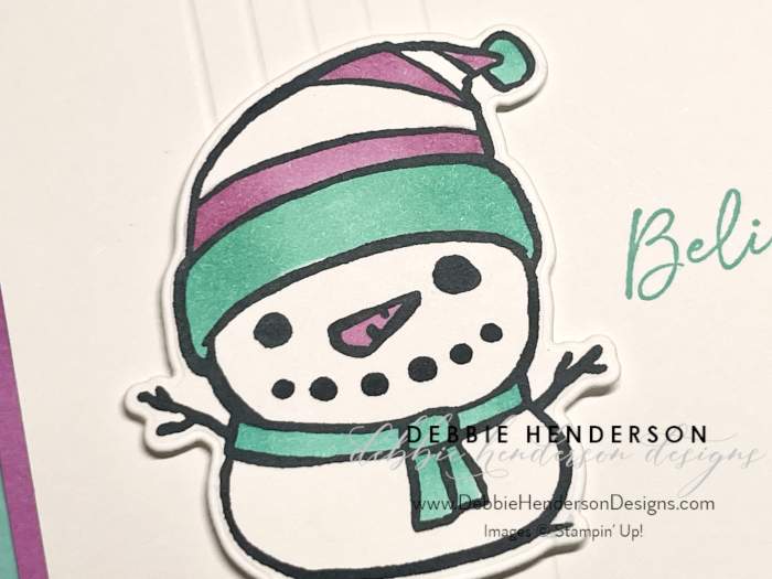 The snowman image is from Festive Friends. What I love the most about this stamp set, is how large the snowman, Santa and elf images are which makes it so fun & easy to color with Stampin’ Blends: