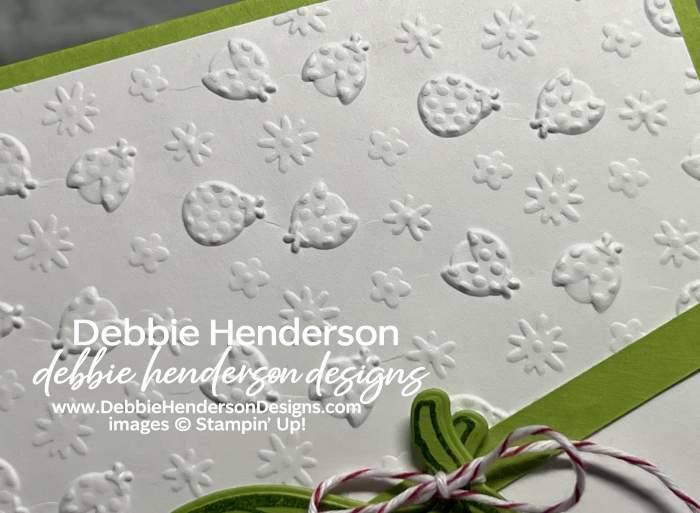 - Tools & Accessories: Springtime Scenes Dies, Real Red & White Bakers Twine, Ladybug Garden Epoxy Shapes, Ladybug Picnic 3D Embossing Folder, Stampin’ Dimensionals