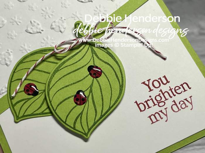 I have two types of ladybugs on my card today for my critters or insects. You’ll see dry embossed ladybugs from the Ladybug Picnic 3D Embossing Folder and cute Ladybug Garden Epoxy Shapes sitting on my leaves: