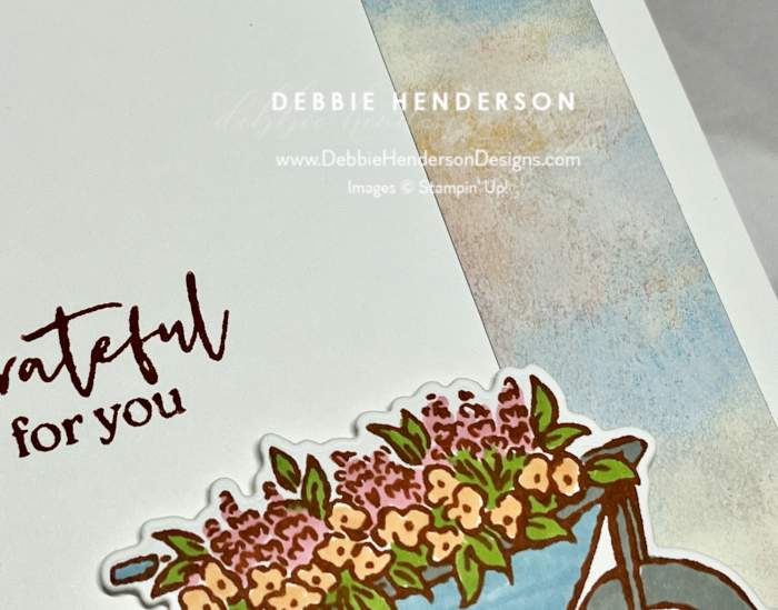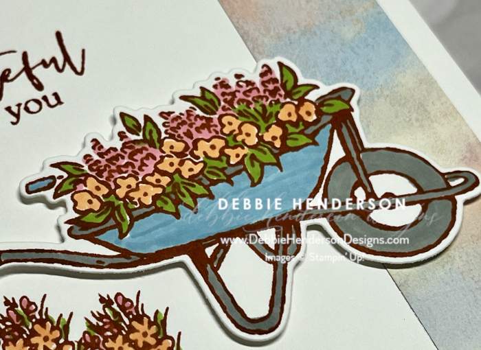 I love to garden. I have many flower beds and also a veggie garden. I have had an idea in my head for quite a few years but haven’t found an old wheelbarrow yet. The card I created today kind of reminds me of that idea: