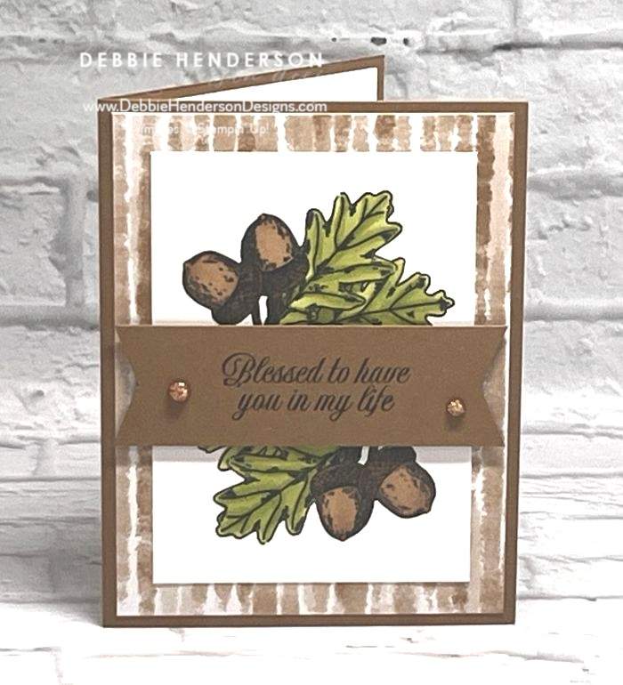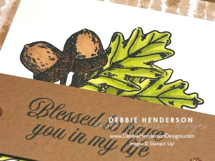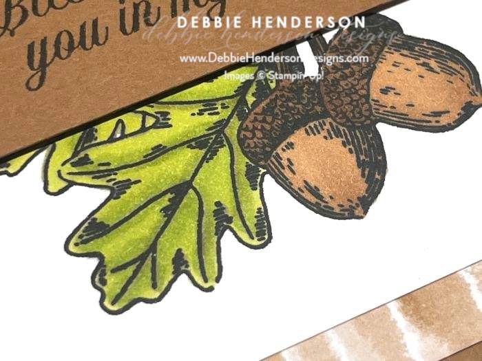 - Layer 3: Basic White Cardstock 4-1/2 3-1/4. Using the center of the cardstock layer as a guide, stamp the acorn image from center to bottom and again center to top with Memento Black Ink. Don’t worry if the 2 images overlap as the banner will cover the middle. Color with Stampin’ Blends. Glue to card front.