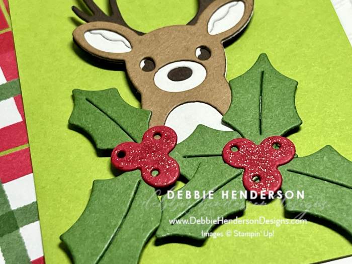- Holld & Berries: Cut two of each using Garden Green for the leaves and Real Red for the berries. Assemble and glue over the reindeer. Color the berries with Wink Of Stella.