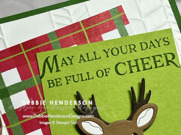 - Reindeer: Use all 3 dies with Early Espresso, Basic White & Pecan Pie Cardstock. Assemble the deer and glue to card front with Stampin’ Dimensionals.