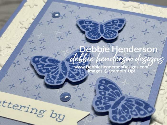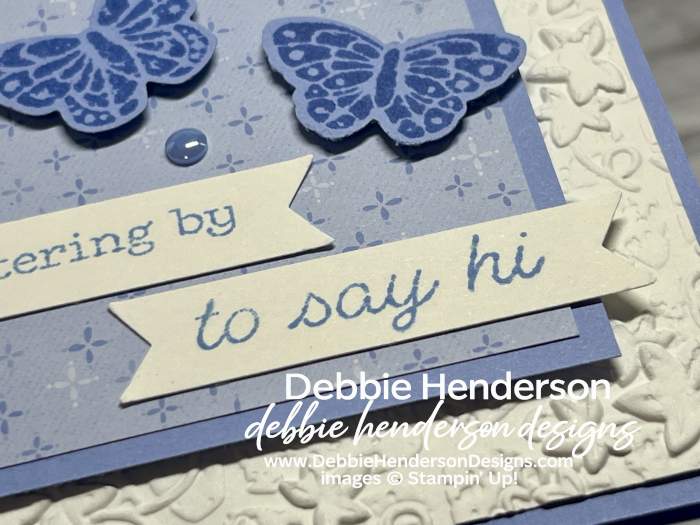 • Butterflies: Stamp the butterflies on Hyndrangea Hue Cardstock with Hydrangea Hue Ink. Cut with the punch. Glue to designer paper with Stampin’ Dimensionals.