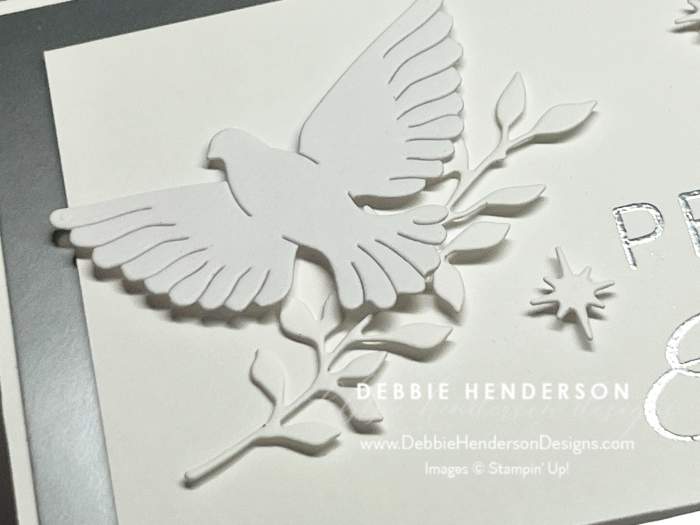 I also heat-embossed the sentiment with silver embossing powder and used a layer of Silver Foil Sheets. Isnt’ the diecut dove beautiful?