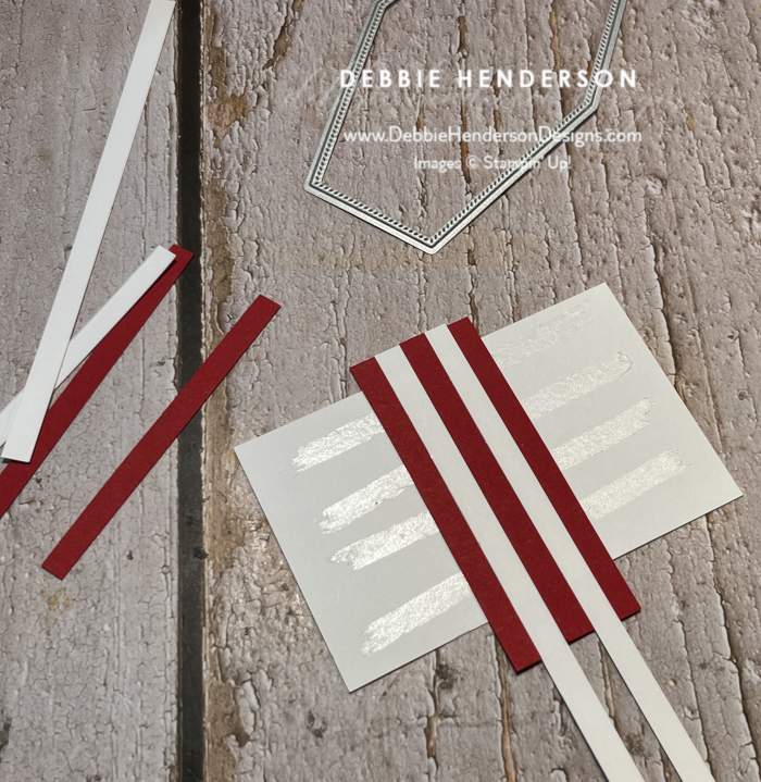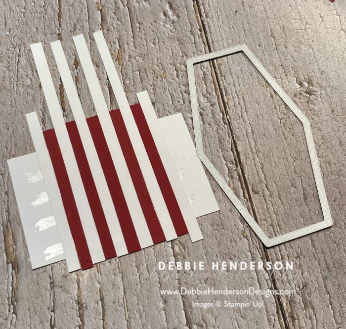 - Cut strips of cardstock 1/4″ wide. I used (5) in Real Red and (6) in Basic White.