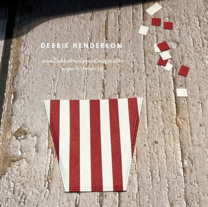 - Box: Create the popcorn box using the steps above and glue to designer paper layer with Stampin’ Dimenisonals.