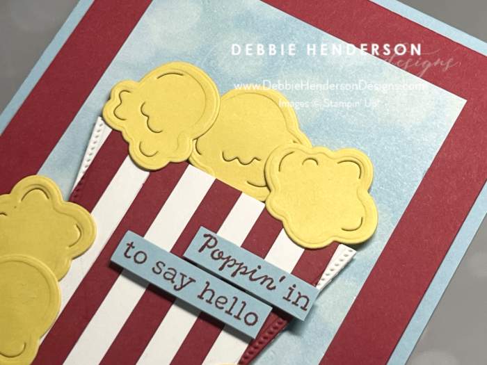 - Sentiment: Stamp the sentiment on Balmy Blue Cardstock with Real Red Ink. Cut close to the wording and split into 2 lines of text. Glue to popcorn box with Stampin’ Dimensionals.