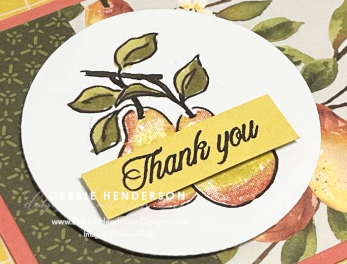- Layer 5: Basic White Cardstock cut with the 2-3/8″ Circle Punch. Stamp the pears lined image with Early Espresso Ink. Ink the bold pears image with Darling Duckling Ink and then again on the outside edges only with Calypso Coral Ink (Rock & Roll Technique). Stamp inside the lined image. Color the leaves with Stampin’ Blends. Glue to card front at the left with Stampin’ Dimensionals.