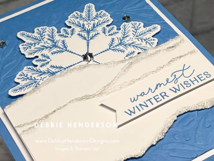 • Snow: Tear 3 strips of Basic White Cardstock 3-3/4″ wide. Add Clear Wink Of Stella to the edges. Glue all 3 of the strips together so edges are showing. Glue over the snowflake with Stampin’ Dimensionals.