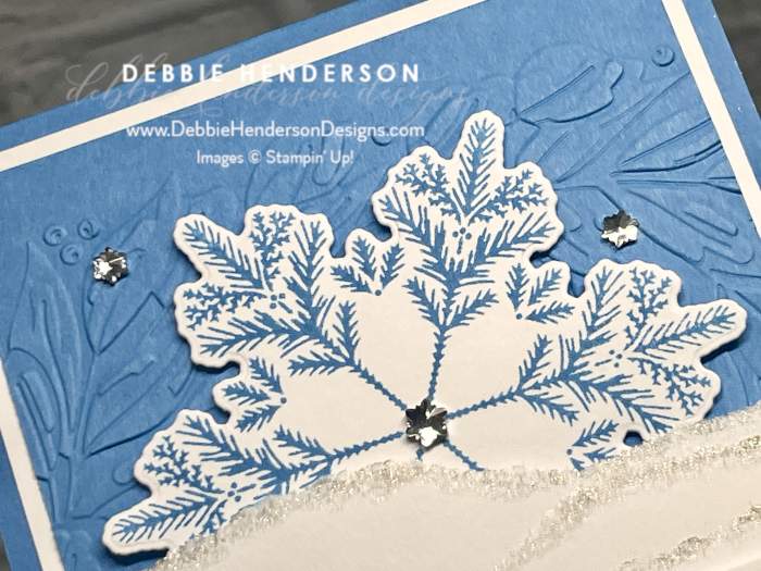 • Sentiment: Stamp the sentiment on Basic White Cardstock 2-1/4 x 5/8 with Azure Afternoon Ink. Use Paper Snips to cut the left end into a banner shape. Glue over the snow layers even on the right with Stampin’ Dimensionals.