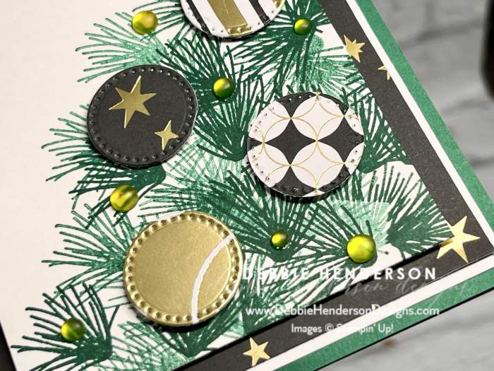 - Cut several ornaments with the smallest circle die from Stylish Shapes Dies and multiple patterns from the Modern Christams Designer Paper. Glue to the tree and trim to fit the ones going off the sides.