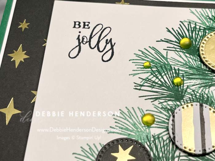 - Stamp the pine needles repeatedly with Shaded Spruce Ink. Stamp twice without reinking for a lighter shade. Start at the bottom and work your way up to the right-hand corner for a tree shape.