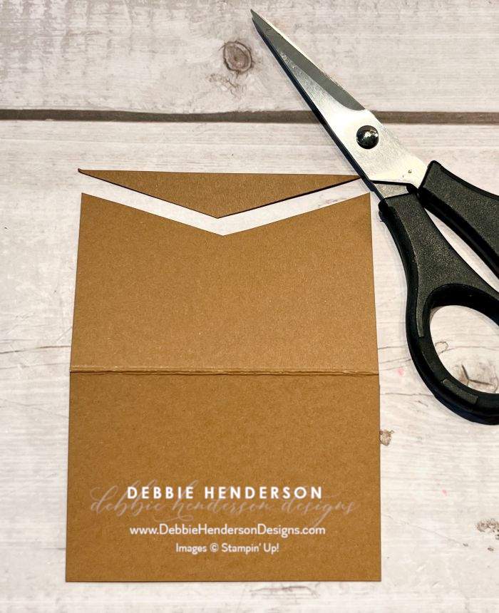 - Pocket: Pecan Pie Cardstock 4 x 3. Score at 2″ on the 4″ side. Cut a “V” shape at the top as shown below. Add Tear & Tape to the two sides and press in place for form pocket.