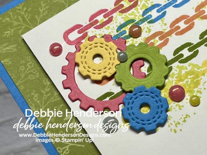 - Gears: Cut several gears using the 3 smallest dies with Strawberry Slush, Granny Apple Green, Azure Afternoon and Daffodil Delight Cardstocks. Glue the largest one flat and the 3 others with Mini Stampin’ Dimensionals cut in half.