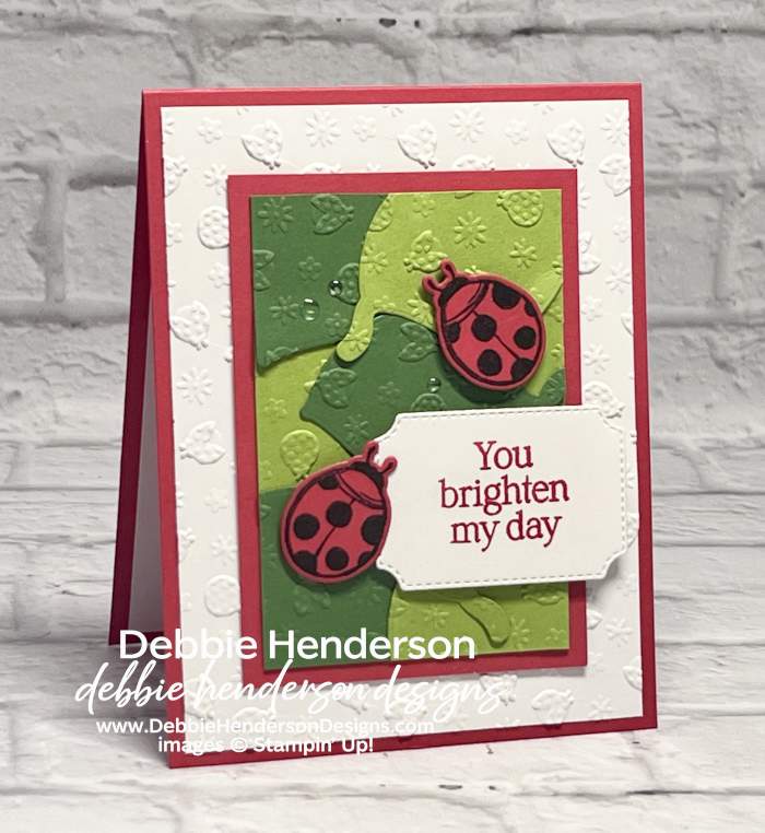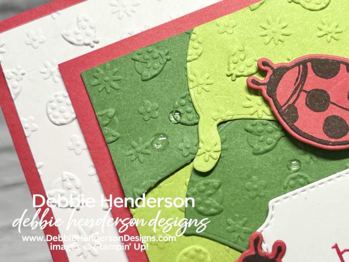- Layer 2: Basic White Cardstock 5-1/4 x 4. Emboss with the Ladybug Picnic Embossing Folder. Glue to card base.