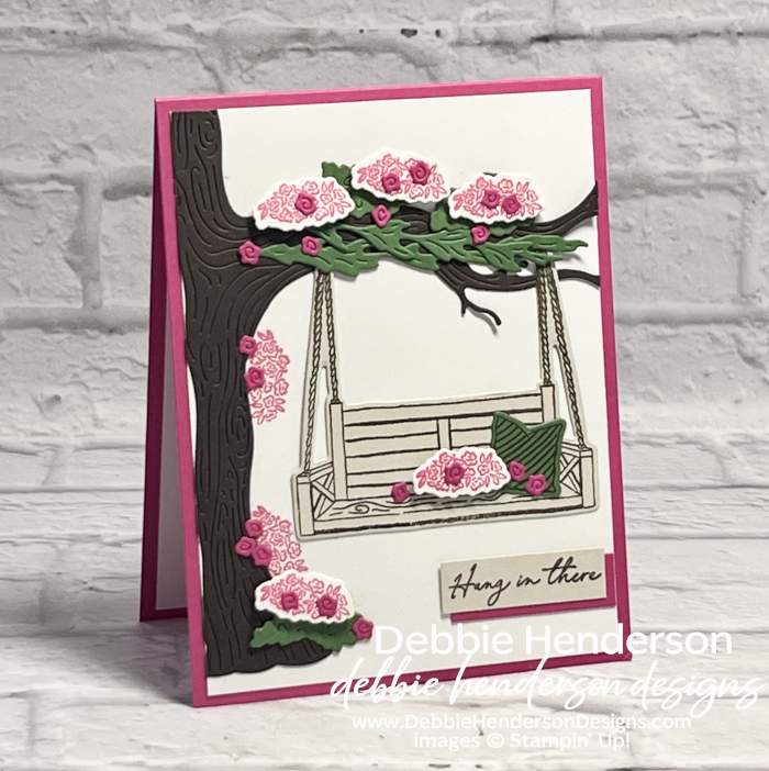 - Stamped Flowers: Stamp the flower cluster image twice along the tree trunk. Stamp 5 more on Basic White Cardstock. Cut with the die. Glue 3 to the top of the tree, one on the swing and one to the bottom of the tree trunk, all with Stampin’ Dimensionals.