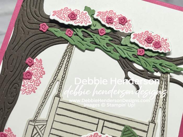 - Roses: Cut a bunch of roses using Melon Mambo Cardstock with the die and glue to the cluster flowers, pillow, swing, tree trunk and foliage.